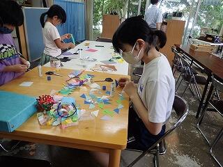 七夕飾りを作りました。飾りの作り方を聞き、折り紙を使って切ったり貼り付けたりしながらたくさんの飾りを作り飾り付けをしました。また、お願いを書いた短冊も笹の葉に飾りました。
