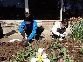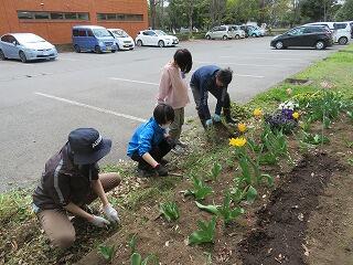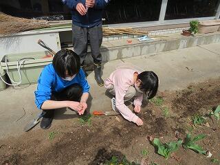 花壇にポップコーンとにんじんの種をまきました。また、プランターには、小ネギの種をまきました。草が伸びてきていたので除草も行いました。