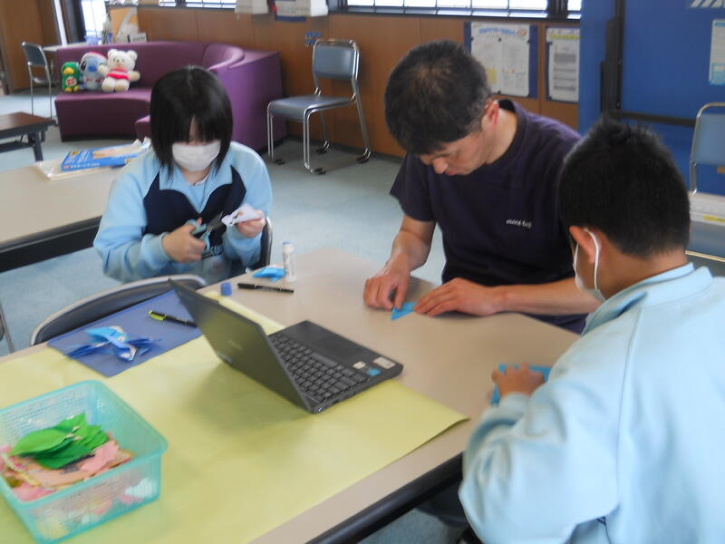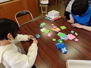 今日は、花壇の空いているところにジャガイモの種芋を植え、プランターにフウセンカズラの種をまきました。その後、教室の掲示物に付ける飾りを折り紙でたくさん作りました。