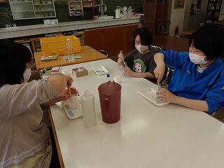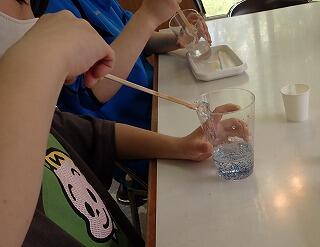 スライム作りをしました。スライムにグリッター(ラメ粉)をいれて、キラキラするスライムを作りました。スライムが服についたときの対処法についても学び、クエン酸水溶液を使ってスライムが溶けてさらさらになる様子を実験して確かめました。