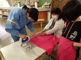 小風呂敷の作成を始めました。大きな布に長さを測って印を付けたり、布を切ったりして縫う準備をしました。布の切り口を三つ折りにしてアイロンがけをするのが難しく、苦労していました。今年は、少し難しいことにも挑戦していこうと思います。