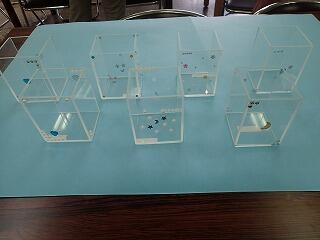 アクリル板から切り出した部品を使って、えんぴつ立てをつくりました。切り口を紙やすりで丁寧に削り、専用の接着剤を使って組み立てました。注射器を使って接着剤を付けるのが難しく、時間をかけて丁寧に作業していました。最後にデコレーションシールを貼り、完成させました。