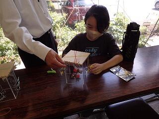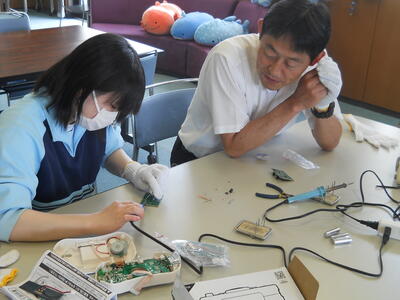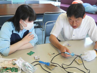 先生ははんだごてを使って、優しく見本をみせてくれました。通室生もそれを見て、いよいよスタートです。また今日は学校の先生が来てくださるので、通室生も心待ちにしていたようです。お忙しい中だったかと思いますが、通室生のためにありがとうございました。
