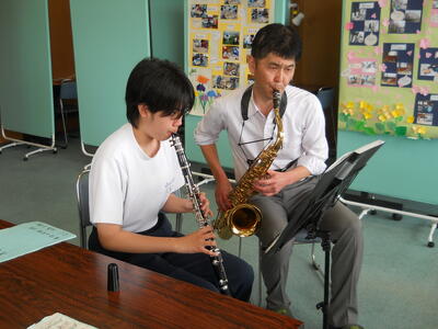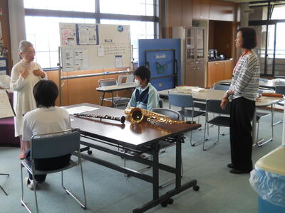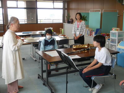 二宮教室では初めての音楽教室です。小堀先生の自己紹介から始まり、童謡の数々を日本の四季と重ねながら穏やかに紹介していただきました。通室生も知っている曲は口ずさんでいました。またクラリネットが吹ける通室生もいたので、職員と一緒に「翼をください」の二重奏をしました。その他、「赤とんぼ」「四季のうた」などを楽しみました。