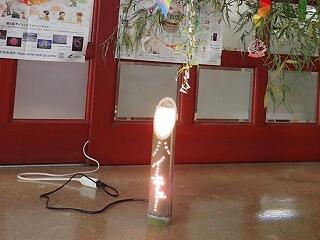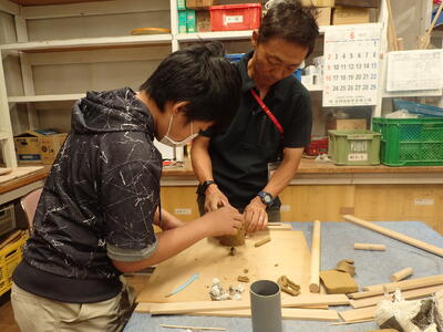 竹灯ろうづくりに挑戦しました。紙にデザインを描き、どこに穴を開ければよいかを考えながら設計図を作成しました。設計図を竹筒に貼り、設計図に従って、ドリルで穴を開けました。中に電球を入れて明かりをともすと、穴から光が漏れてとてもきれいな灯ろうができあがりました。