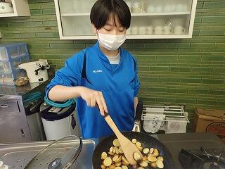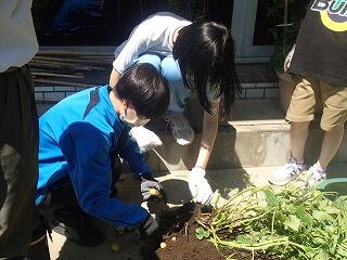 農園活動を行いました。畑の除草をし、チンゲン菜の種まきをしました。また、ジャガイモの試し堀りをしました。紫のジャガイモはあまり大きくなっていませんでしたが、もう一つの種類(キタアカリ)は大きくなっていました。特に大きい芋は金曜日の調理教室で使う予定です。小さい芋は、油で炒めて、塩こしょうで味付けをして試食しました。新じゃがは皮がうすく、皮付きのまま炒めてもおいしく食べることができました。