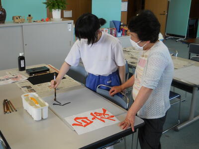 今日は今年度2回目の書道教室を行いました。通室生は前回とは違う、好きな文字を自分で選びました。また講師の石田先生からも、「ここの部分が上手に書けてるね」と優しく言葉をかけてくださり、のびのびと書くことができたようです。