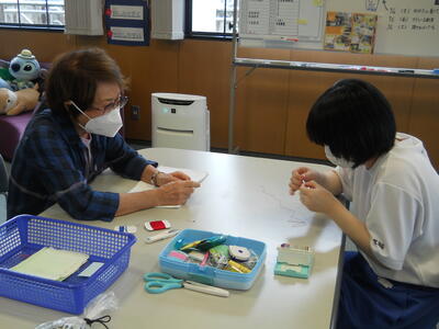 前回の続きで、糸通しから始まり、玉止め、玉結び、波縫いなどを練習しました。