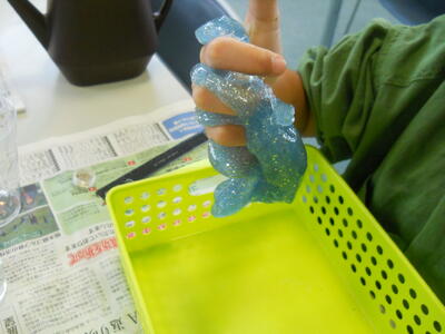 今日はスライム作りをしました。好きな色になるように、4色の食紅粉をまぜてみたりしました。キラキラ光るラメも入れると、自分だけのオリジナルスライムの完成です。いろんな形にしてみたり、感触を楽しみました。