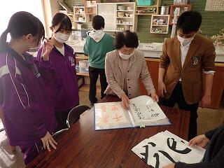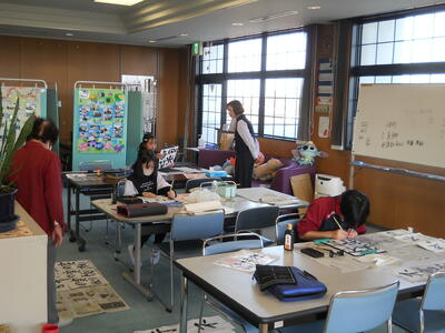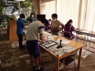 書道教室を実施しました。条幅に書く言葉をお手本やパソコンで探し、決めた言葉の文字一文字を半紙に大きく書く練習をしました。はねや払いの運筆についてボランティアの先生に詳しく教えていただき、繰り返し練習しました。はじめに書いた文字よりもかなり上手に書けるようになり、みんなでその成果を確かめ合いました。