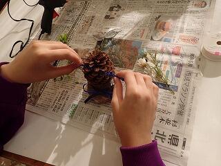松ぼっくりなどの木の実を使ってオーナメントを作りました。木の実に色を付けたりデコレーションボールやビーズ・リボンで飾り付けしたり、各自の発想を生かしてかわいい飾りを作りました。