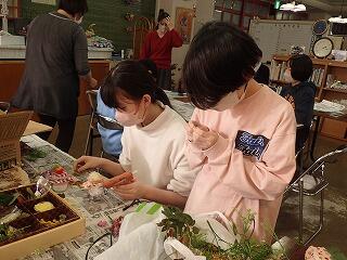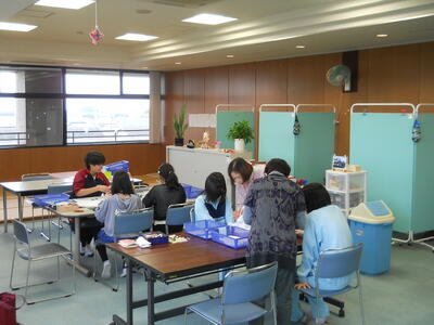 フラワーアレンジメント教室で消臭ボトルづくりをしました。小さな瓶の中に重曹を入れ、布とリボンで瓶の口を閉じで、造花で飾り付けをしました。ボランティアの先生の説明を聞き、仕事を分担して流れ作業で消臭ボトルを作成しました。かわいい消臭ボトルがたくさんできあがりました。作品展の時の販売する予定です。