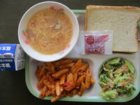 今日の給食は「スラッピージョー」「もやしのカレードレッシングあえ」「コーンチャウダー」です。