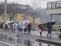 曇り空の中、東っ子たちが元気に登校してきました。