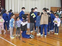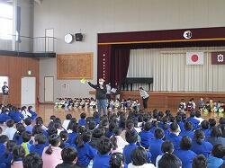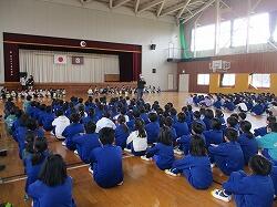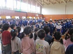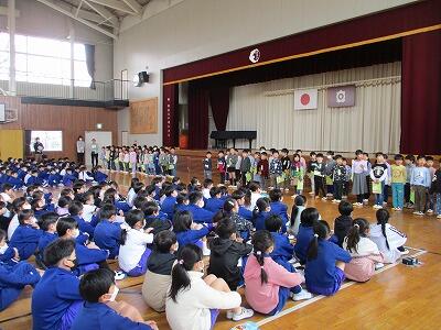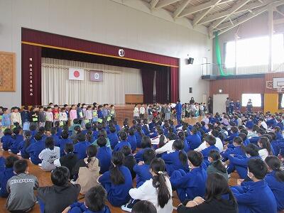 体育館に集まって、全校児童で迎え入れ、温かい雰囲気の中、実施することができました。