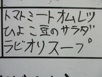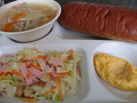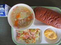 今日の真岡東小学校の給食は、トマトミートオムレツ、ひよこ豆のサラダ、ラビオリスープ、黒糖パン、牛乳のメニューで、619Kcal(中学年)でした。