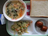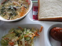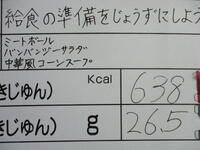 一学期の初日の今日の給食は、ミートボール、バンバンジーサラダ、中華風コーンスープ、食パン(チョコ大豆)、牛乳のメニューで、638Kcal(中学年)でした。