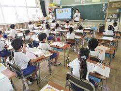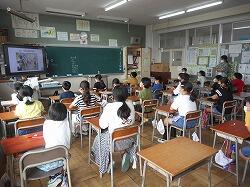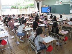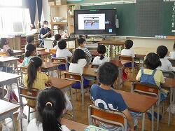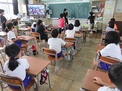 そして、今日は、2年1組が1年1組に、2年2組が1年2組にオンラインで発表しました。実際に手に取って触れる体験はできませんが、1年生の目は、電子黒板の画面に釘付けでした。クイズも盛り上がっていました。