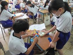 <6年2組> 図工の授業におじゃましました。プラスチック段ボールを使って、ランプシェード作りをしていました。ランプシェードの光の模様を考えました。設計図ができた子は、早速、製作に取りかかっていました。出来上がりが楽しみです。