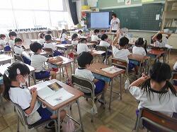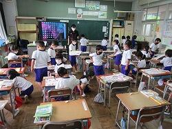 <1年1組> 音楽の授業におじゃましました。歌に合わせて体を動かしたり、手遊びをしたりしていました。1学期の復習です。リズムに合わせて、上手に身体表現できていました。
