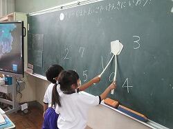 <1年2組> JTEと担任による外国語活動の授業におじゃましました。1から10までの数を英語で覚えていました。その後、1から10までランダムに書かれた黒板の数字をハエたたきで早打ちするゲームを行いました。友達が言った英語の数をハエたたきで素早くたたきます。2人ずつ対戦して盛り上がりました。1年2組のみなさん、Good job!