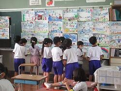 <1年2組> 図工の授業におじゃましました。全員の「くじらぐも」の絵が完成し、全面の黒板一面に貼られていました。今日は、友達の絵のいいところを発表し合いました。たくさん手が挙がり、よいところがたくさん発見されました。