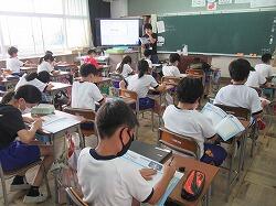 <3年2組> 社会科の授業におじゃましました。予定していたスーパーマーケットの見学が中止となっていましたが、今回、スーパーさんのご厚意で、スーパーの紹介教材をご提供いただきました。スーパーの店長さん自ら製作してくださったそうで、感謝しかありません。早速、その教材を使って学習をしていました。写真あり、クイズありで、子供たちの視線は釘付けでした。予定していた見学では、お店の中には入らない予定でしたから、見学以上に、勉強になりました。スーパーマーケットの皆様、お忙しい中教材を作成していただき、ありがとうございました。