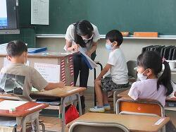 手渡すときに子供たちに分かる言葉で、1学期の頑張りを伝えています。保護者の皆様には、来週の個人懇談でお伝えさせていただきます。よろしくお願いいたします。