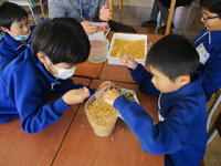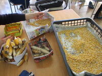今日は農園で栽培して乾燥させたトウモロコシの実を集めていました。たくさんの実が取れて、とても楽しそうに作業を進めていました。