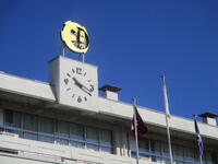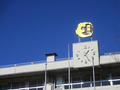 校舎の上にある真岡東小学校の校章が、青空をバックにして太陽に光を反射して輝いていました。