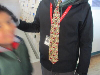 英語専科の先生のネクタイはサンタクロース柄です!