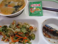 「冬至給食」のメニューは、いわしのみぞれ煮、ゆずかつおあえ、ほうとう汁、ごはん・のりたま、牛乳で、610Kcal(中学年)です。