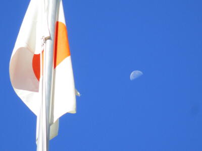 東っ子の子供たちは、今日も元気に登校してきました。青い空にはちょうど半分ほどになった白い月がまだ見えています。