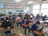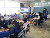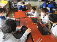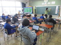 < 6年1組 > 理科の授業で、人と環境とのかかわりについて、タブレットを使って班ごとに熱心に話し合いながら学習に取り組んでいました。