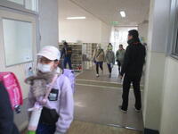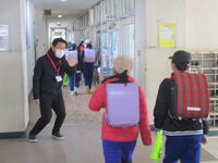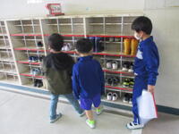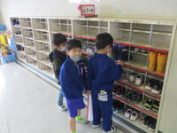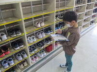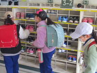 今朝も1年生の係の東っ子が、昇降口で靴の置き方の確認をしていました。