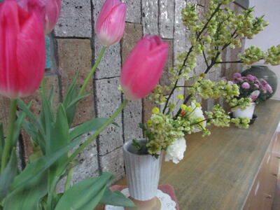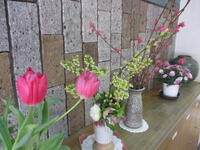 卒業式の演台に飾られていた花が、今は職員玄関に飾られています。