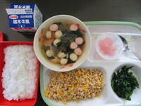 今日の給食は明後日の3月3日の「ひな祭り(桃の節句)」にちなんだ「ひな祭り給食」で、とりそぼろ・卵そぼろ・ほうれん草の三色ごはん、紅白すまし汁、ミニデザート桃ゼリー、牛乳のメニューで、594Kcal(中学年)でした。