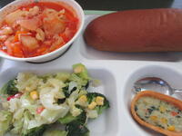 今日の給食は、国産野菜のホワイトグラタン、イタリアンサラダ、ミネストローネスープ、黒糖パン、牛乳のメニューで、634Kcal(中学年)でした。