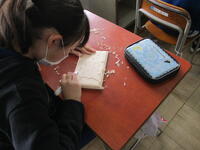 < 6年3組 > 図画工作で、卒業制作のオルゴールの箱をタブレットなどを使いながらデザインして、彫刻刀でていねいに彫り進めていました。