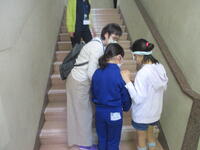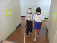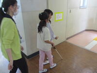 今回の体験活動は「アイマスク体験」でした。2人1組でペアになって、アイマスクを付けて白杖を使いながら階段の上り下りなどを体験しました。