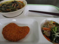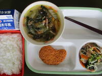 今日の真岡東小学校の給食は、焼いてチキンカツ、わかめときゅうりのあえもの、春雨スープ、ごはん、牛乳のメニューで、625Kcal(中学年)でした。