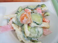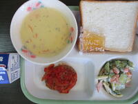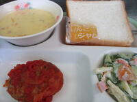 今日の真岡東小学校の給食は、ハンバーグトマトソースかけ、マカロニサラダ、コーンポタージュ、食パン(リンゴジャム)、牛乳のメニューで、694Kcal(中学年)でした。
