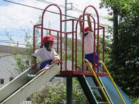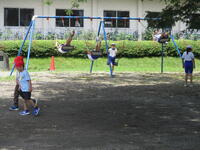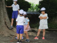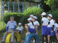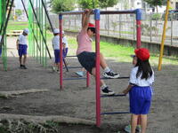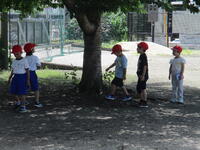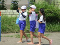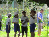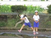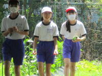 日陰や水たまりで遊んでいる東っ子、プールの準備を持って外に出てきている東っ子、先生と一緒に遊んだりお話している東っ子、学校農園で野菜を収穫している東っ子などなど、一人一人が思い思いに昼休みを過ごしていました。