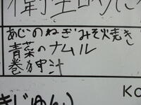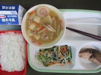 今日の真岡東小学校の給食は、あじのねぎみそ焼き、青菜のナムル、巻狩汁、ごはん、牛乳のメニューで、604Kcal(中学年)でした。