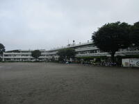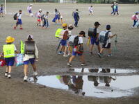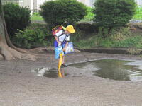 東っ子たちは、今日も元気にあいさつしながら登校してきました。水たまりで遊んでいる東っ子もいます。
