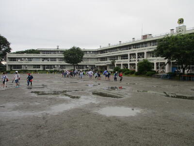 校庭にはまだ水たまりがありますが、雲ひとつない青空です。