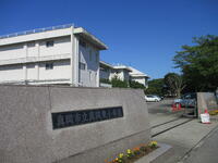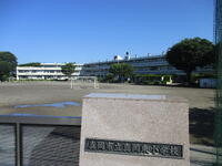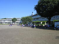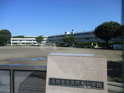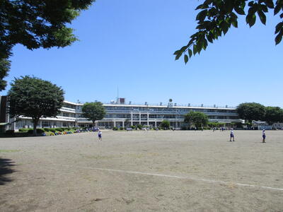 正門や東門から見た真岡東小学校の白くて"クの字"型の特徴的な校舎が青空に映えています。