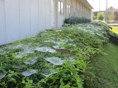 今朝早くは霧が出ていたので、植え込みの"クモの巣"に水滴がついて白く見えていました。