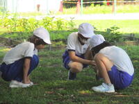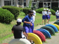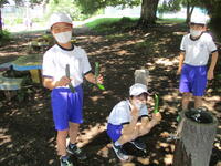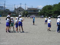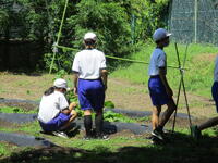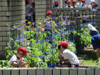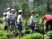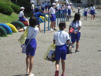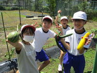大切に育てているアサガオに水やりしている1年生の東っ子や、学校農園で野菜の世話や収穫をしている5年生の東っ子たちもいます。水たまりで遊んでいる東っ子や、プールでの授業を終えて戻ってきている3年生の東っ子たちもいます。