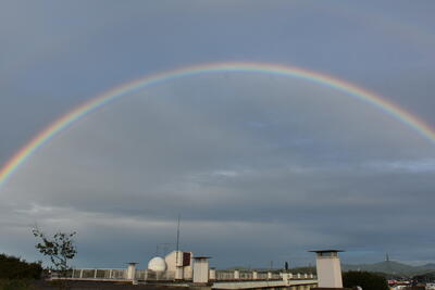昨日の夕方に校舎の向こう側に見えたきれいな半円の虹です。